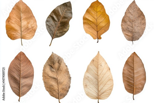© Aether Pixels, Fototapeta premium Isolated arrangement of eight autumn leaves on white background studio shot centered view botanical illustration autumnal foliage