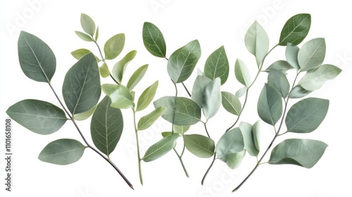 © AbstractAI, Naklejka premium Isolated arrangement of lush green leaves showcasing various shapes and shades against a pristine white background, ideal for enhancing visuals.