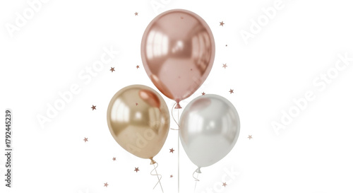 © Sergiu, Obraz premium Isolated arrangement of three reflective party balloons in varying shapes and colors float upwards
