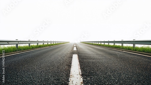 © The 2R Artificiality, Fototapeta premium Isolated asphalt pathway with barriers and greenery seen from a side angle on white background
