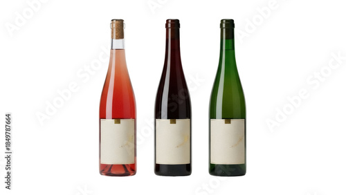 © Johanna, Fototapeta premium Isolated assorted glass wine bottles row, red, rosé, green. No labels on the bottles. Mockup.
