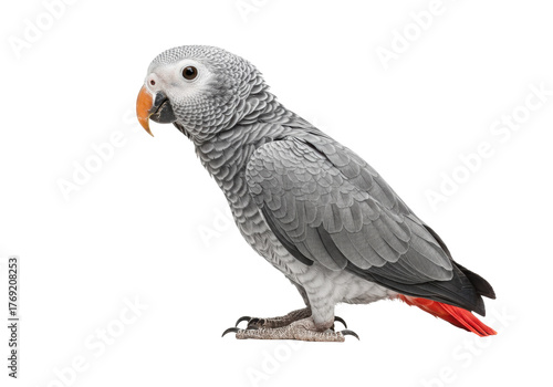 © Dennis, Naklejka premium Isolated beautiful African grey parrot stands, side view, bright orange beak, tail feathers