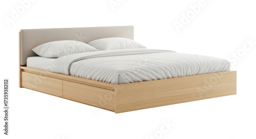 © Ryan, Obraz premium Isolated Bed frame with storage drawers and light colored headboard, bedsheets and pillows