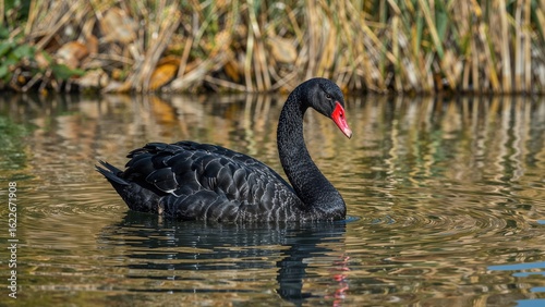 © TheWaterMeloonProjec, Fototapeta premium Isolated Black Swan Swimming in a Pond During Fall Season