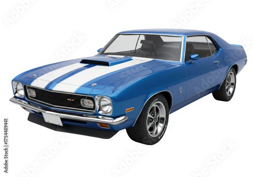 © Sophia, Naklejka premium Isolated blue 1970s muscle car with white racing stripes sitting alone in studio lighting