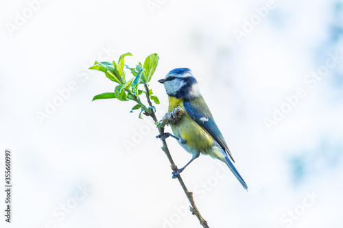Obraz premium isolated blue tit bird (parus caeruleus) standing on tiny branch