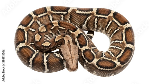 Obraz premium Isolated brown and beige coiled python snake, resting and posing calmly with...