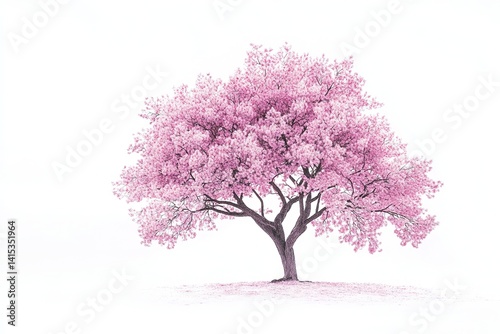 © Minimalist, Naklejka premium Isolated Cherry Blossom Tree with Pink Flowers, Full Bloom Against White Background