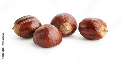© Lala, Obraz premium Isolated chestnuts on a white background showcase the unique texture and shape of chestnuts, highlighting their rich, earthy color and natural beauty in a clean visual format.