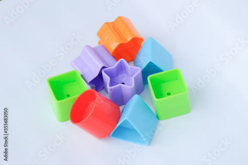 Obraz premium Isolated children's toy blocks in various shapes made of plastic on white...