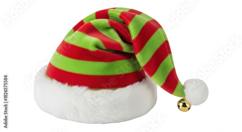 © Aoife, Fototapeta premium Isolated Christmas striped elf hat with jingle bell and white fur trim decoration closeup