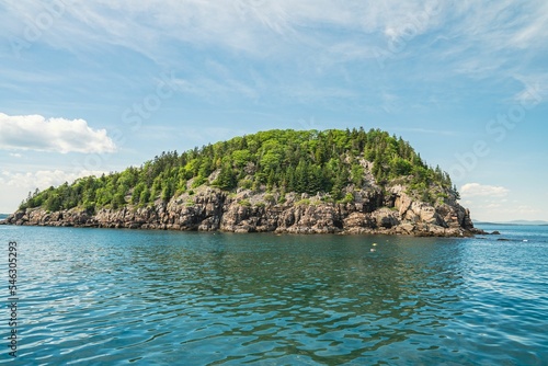 Obraz premium Isolated cliff island covered with dense vegetation surrounded by a waterscape