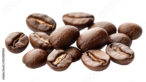 © Varunee, Naklejka premium Isolated coffee beans on a white background showcasing their rich brown color and texture