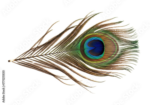 © Andrei, Obraz premium Isolated colorful vibrant single peacock feather displaying unique eye pattern, beauty