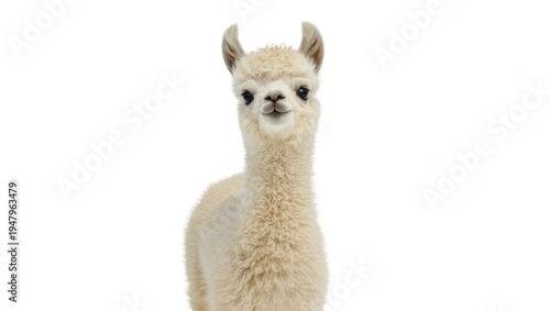 Fototapeta premium Isolated cute domestic farm animal, a young fluffy alpaca with soft wool looking at camera