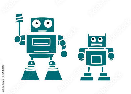 © Grenar, Fototapeta premium Isolated cute funny duo of robots (one taller, one shorter), looking at the viewer. Retro illustration.