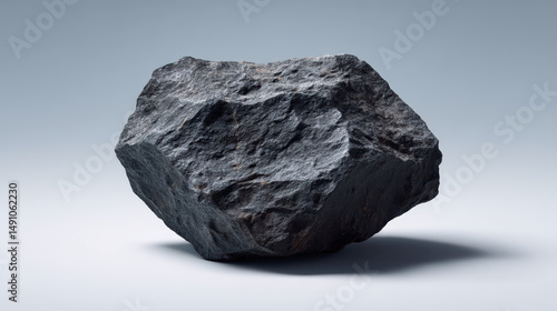 © MasTPX, Fototapeta premium Isolated dark gray rock with rough texture rests on a smooth surface with subtle shadows creating a simple yet elegant composition in a studio setting.