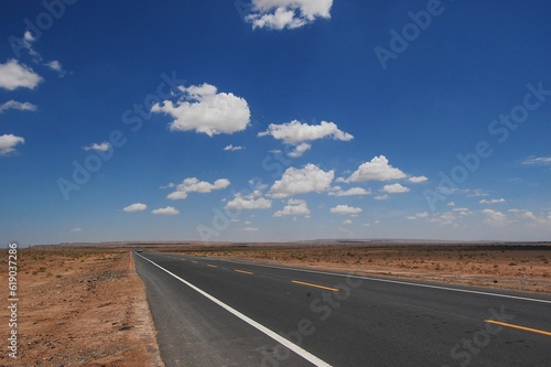 Naklejka premium Isolated desert highway stretching out into the horizon, surrounded by lush clouds