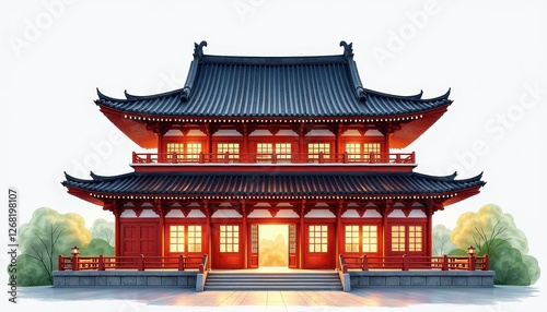 © Mr.Pancho Store, Naklejka premium Isolated digital art of a traditional Asian pagoda with a red roof on a pristine white background. A traditional Japanese pagoda with red and black roofing and windows.