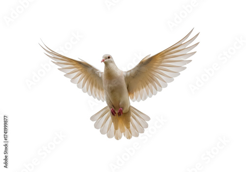 © Florin, Fototapeta premium Isolated Dove flying in air with wings wide open, bird flapping, motion and air current
