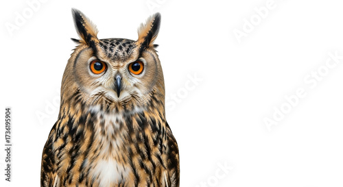 © Trym, Naklejka premium Isolated Eurasian Eagle-Owl looking forward with its orange eyes and prominent ear-tufts