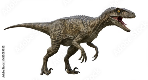 Fototapeta premium Isolated full body shot of a velociraptor with mouth open on a white...