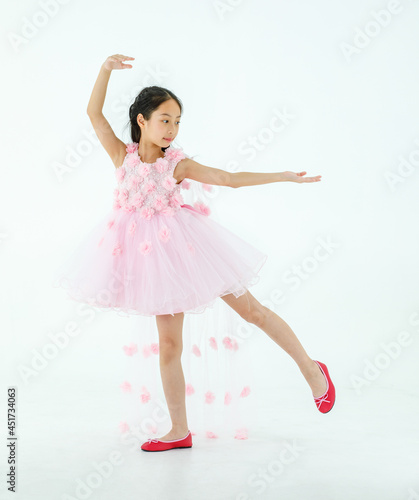 © Bangkok Click Studio, Naklejka premium Isolated full body studio shot of little cute pretty Asian ballerina kid wears pink beautiful roses flowers ballet dress and red shoes smiling posing dancing happily in front of white background