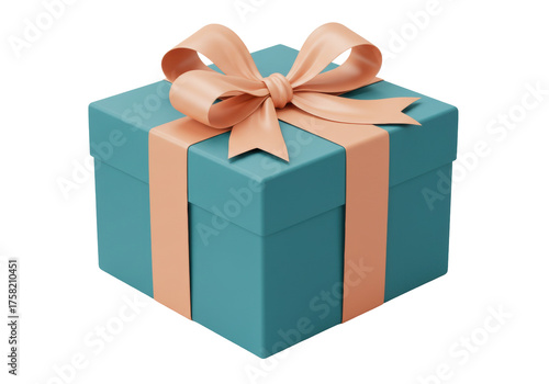 Fototapeta premium Isolated gift box in teal color with peach-colored ribbon and bow, luxury package design