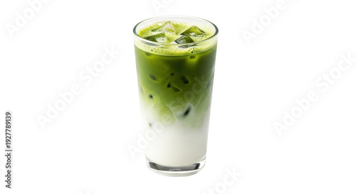 © Elowen, Naklejka premium Isolated glass of cold Matcha latte drink on table, refreshment beverage against backdrop