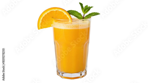 Naklejka premium Isolated glass of fresh orange juice with orange slice and sprig of mint on...