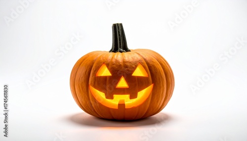 Fototapeta premium Isolated Glowing Jack-O-Lantern on White Background – Classic Carved Pumpkin...