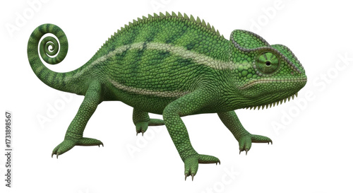 Fototapeta premium Isolated Green Chameleon, Tropical Reptile, Bright, Detailed Skin, and Curled...