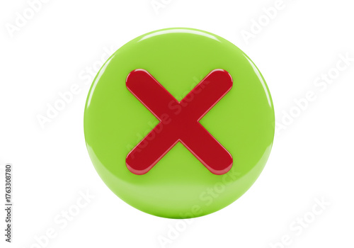 Fototapeta premium Isolated green rounded button, shiny error sign with a red cross mark to...