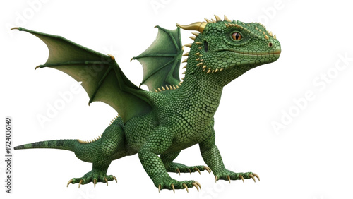 © Paula, Obraz premium Isolated green scaled dragon with wings and small horns, mythical creature concept