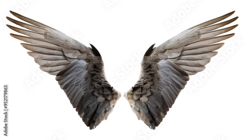 © Png - Video - Photo, Naklejka premium Isolated image of majestic, detailed feather wings, open in a symmetrical arrangement, ideal for design projects or fantasy themes.