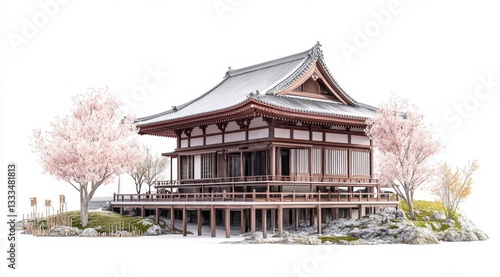 Fototapeta premium Isolated Japanese temple in spring with cherry blossoms