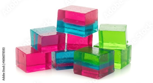 © TiMUCNA, Obraz premium Isolated layered jello cubes in retro neon colors on a white background for creative use