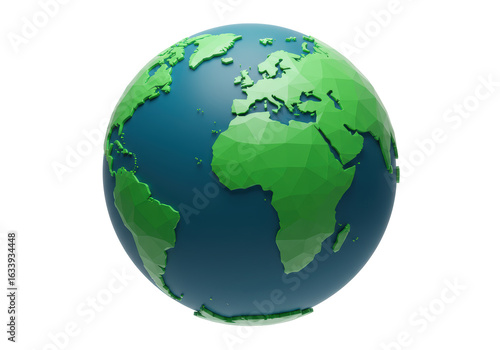 © Eoin, Naklejka premium Isolated Low-Poly Stylized Earth Globe with Green Continents and Blue Oceans