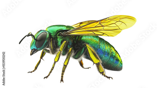 © ColorNest Collective, Fototapeta premium Isolated macro housefly with hairy legs and detailed wings on a white background