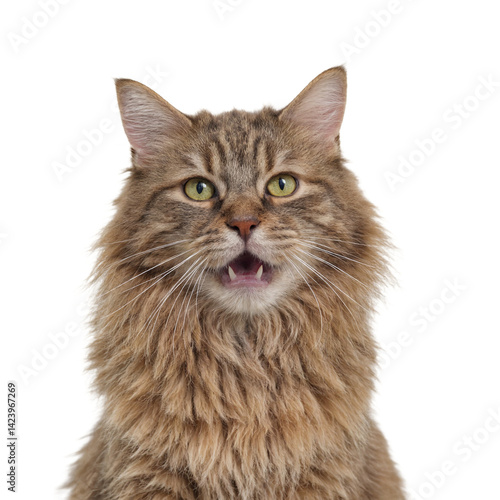 Fototapeta premium Isolated Maine Coon cat headshot with shocked expression for pet lovers and emotion concepts