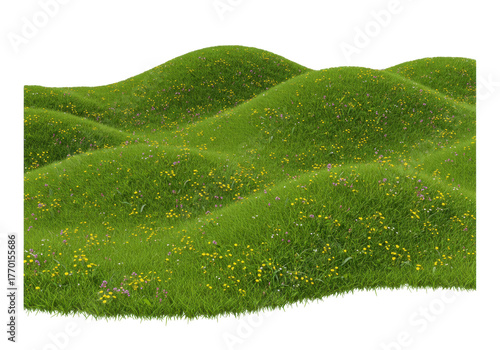 Fototapeta premium Isolated meadow landscape of rolling hills and green grass with wildflowers,...