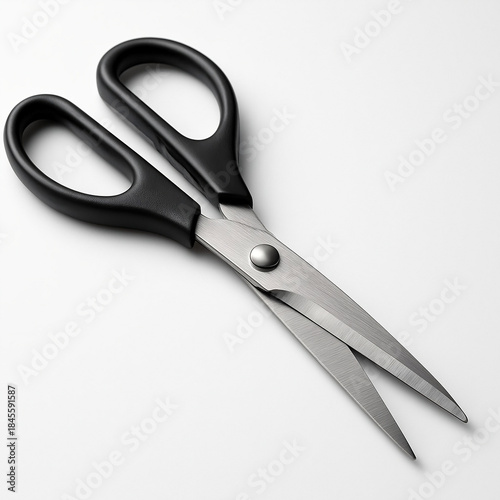 © Irzi, Obraz premium Isolated metal office scissors with sharp steel blades and black plastic handle on a white background