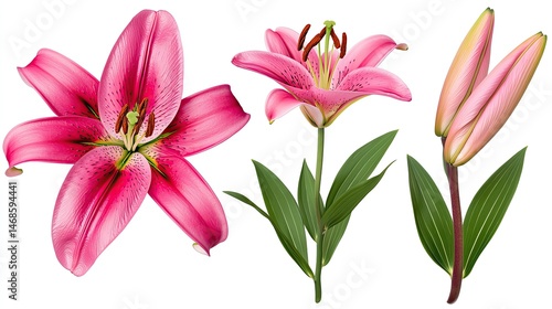 © Pimjan, Fototapeta premium Isolated on white bright pink lily cluster blooming at different stages sharp focus stock style