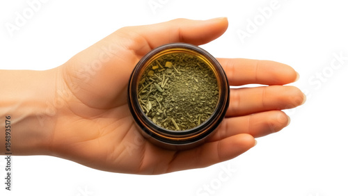 Fototapeta premium Isolated open jar of dried medicinal herb blend in human hand, herbalism, natural remedy