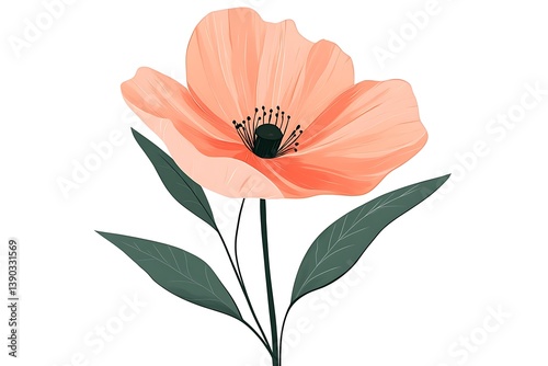 © Humayun, Naklejka premium Isolated Peach Poppy Blossom with Green Leaves and a Dark Center on White Background