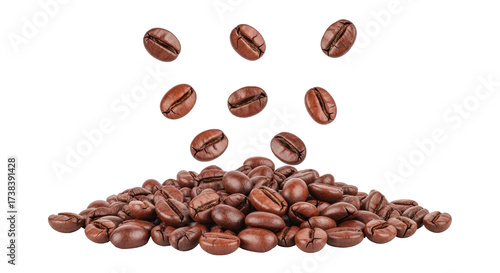 © Sophia, Naklejka premium Isolated pile of roasted coffee beans falling, preparation of a hot drink, studio shot
