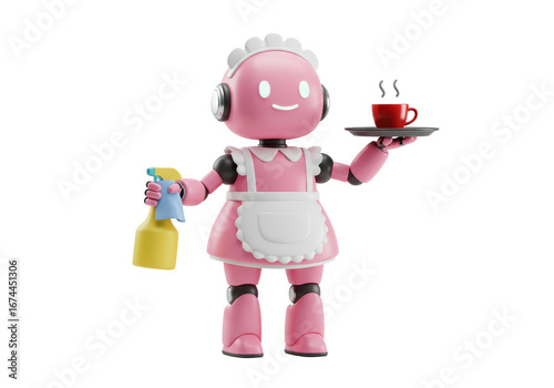 © Nicolae, Fototapeta premium Isolated pink robot maid serving coffee, holding spray bottle with cleaning cloth