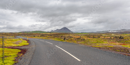 Fototapeta premium Isolated road and Icelandic colorful landscape at Iceland, summe