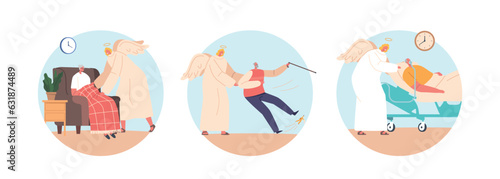 Naklejka premium Isolated Round Icons of Angel Guardians Protect And Support Elderly People,...