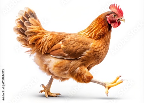 Fototapeta premium Isolated Running Hen on a White Background with Ample Copy Space for Creative Uses in Agriculture, Farming, or Poultry-Related Projects